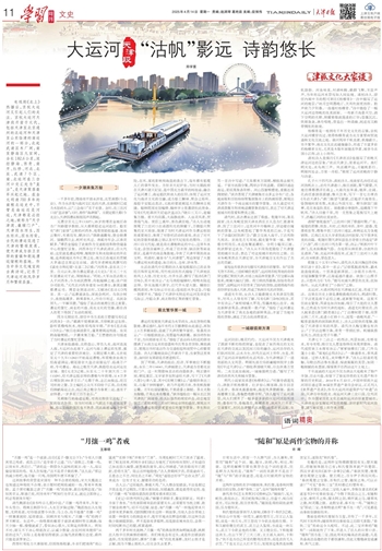 电视剧《北上》热播后,京杭大运河又引起人们的关注。京杭大运河天津段开凿于元代,包括天津至北京通州的北运河和天津至山东临清的南运河的一部分,北起武清区木厂闸,南至静海区九宣闸,全长182.6公里,流经静海、西青、南开、红桥、河北、北辰、武清7个区。南、北运河在三岔河口交汇处为“直沽”,是天津聚落最早兴起之地。在金元明清700多年的南粮北运史中,不管是海运还是河运,天津都是必经之地,被称为“天子津渡、畿辅门户”。天津因水而生,因水而兴,因水而荣,古代的漕运促进了天津的繁荣发展,使天津成为拱卫京师的重镇和朝廷漕运储粮的基地。作为中华文化瑰宝的古典诗词,记录了天津运河的风华岁月和繁荣昌盛。
