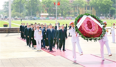 4月15日上午,在越共中央总书记苏林陪同下,中共中央总书记、国家主席习近平瞻仰胡志明陵并敬献花圈。
