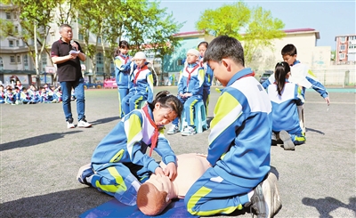 这是红桥区教育系统举办的“青春筑梦新时代 国安护航育新人”全民国家安全教育日主题活动中的一幕。活动现场还进行了校园保安员队列表演、学生自救互救展示、消防云梯救援、教师灭火演练、少年交警指挥操、交通铁骑大队展示、交通安全知识讲座、缉毒犬查缉和校园应急处突演练等。