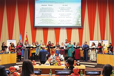 | 以“诗意中国·浪漫风华”为主题的2025年联合国中文日活动开幕式15日在纽约联合国总部举行。本次中文日活动由中国常驻联合国代表团、中国人民对外友好协会、河南安阳市政府和中国文字博物馆等联合举办。多国常驻联合国代表、高级外交官、联合国职员及各界友好人士等400余人出席,共同分享中文之美以及对中华文化的热爱。图为4月15日,在位于纽约的联合国总部,联合国合唱团成员在2025年联合国中文日活动上演唱中国民歌《茉莉花》。 |