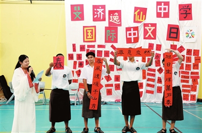 | 4月15日,斐济逸仙中学联合斐济中国文化中心、南太平洋大学孔子学院以及斐济华人文化体育协会在斐济首都苏瓦举办“国际中文日”庆祝活动。图为逸仙中学学生在“国际中文日”庆祝活动上展示书法作品。 |