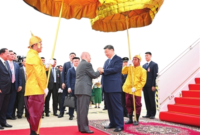 习近平乘专机抵达金边国际机场时,西哈莫尼国王率夏卡朋亲王、阿伦公主等王室成员,人民党主席、参议院主席洪森,国会第一副主席钱业以及郭索帕、布拉索昆、韩春那洛、韶索卡、洪玛尼等五位副首相在机场热情迎接。礼兵分列红毯两侧。柬埔寨王室珍娜公主向习近平献上茉莉花手环,女青年沿途向红地毯抛撒花瓣。