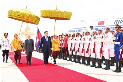 西哈莫尼在机场为习近平举行隆重欢迎仪式。