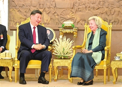 新华社金边4月17日电(记者 乔继红 孙楠)4月17日晚,国家主席习近平同柬埔寨太后莫尼列在金边王宫举行会见。
