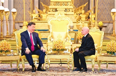 习近平指出,中柬友好跨越千年,两国人民始终双向奔赴、相互成就。无论国际风云如何变化,中柬两国坚守信义、守望相助,在涉及彼此核心利益和重大关切问题上始终坚定相互支持,树立了大小国家平等相待、真诚互信、互利共赢的典范。中柬两国始终走在构建人类命运共同体前列,给柬埔寨民众带来实实在在的好处。
