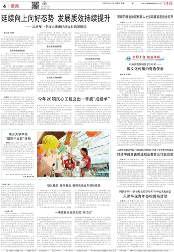 在60项具体工作中,30项超额完成既定目标。其中:“建设‘津彩e就业’驿站”项目,一季度已建成94家并启动试运营。轨道交通建设项目取得重要进展,地铁4号线北段(小街站至西站站)、地铁7号线(赛达路站至鼓楼站)均已提前实现空载试运行。城市防汛排涝建设项目,已完成宾馆南道、中嘉路等30余条道路,共72公里的管道清淤工作,累计已完成二级河道清淤疏浚102公里,对10条重点山洪沟道进行清淤疏浚,累计疏浚11.51万立方米。利用城市边角地块、闲置空地增建停车场11处,增加停车泊位1890个。