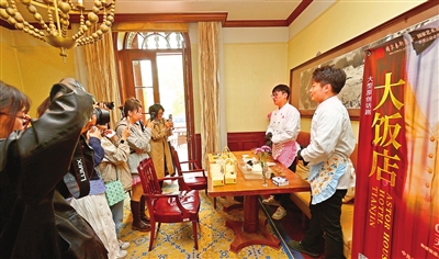 本报讯(记者 高爽 摄影 姚文生)18日,天津人民艺术剧院(以下简称天津人艺)大型原创话剧《大饭店》在百年历史建筑利顺德大饭店举办戏剧体验活动。青年演员李征宇、沈博阳、许瑞尧、张天镱与观众深度互动,分享创作感悟,并化身“服务员”现场制作栗子蛋糕,还原剧中情境。