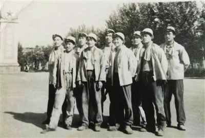 突然来了几个年轻人,师傅们都很兴奋。组长让一位师傅带着我们去仓库领劳保用品——白色帆布工作服、鹿皮大头鞋。我们穿上工作服之后,拍了一张纪念照,表明我们已经是炼钢工人了,非常神气。