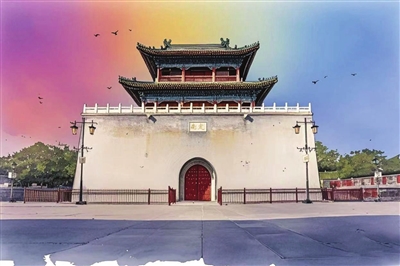 鼓楼见证天津从古至今的变迁,承载着厚重的城市文化记忆。这幅水彩画中,朱砂飞檐在水彩中融化成流动的琴键,斗拱间的彩绘在水墨晕染中泛起涟漪。鼓楼的剪影在靛蓝与鎏金的碰撞中苏醒,每一道木质肌理都浸透着津沽风情与城市人文底蕴。天空正以敦煌壁画的配色泼洒晚霞,风过时抖落一串鎏金音符,让鼓楼的飞檐斗拱在水彩笔触中泛起微光。古韵今风,鼓楼尽显独特意境和风采。