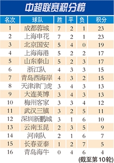 本报讯(记者 顾颖)中超联赛第10轮的焦点战,当仁不让是9轮过后暂居积分榜次席的成都蓉城队,主场对阵榜首的上海申花队。最终蓉城队1:0战胜申花队,两队同积23分,蓉城队以净胜球优势反超申花队,暂时领跑积分榜。