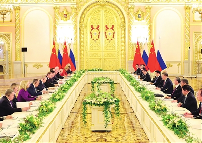 当地时间5月8日上午,俄罗斯总统普京同中国国家主席习近平在莫斯科克里姆林宫举行会谈。这是两国元首举行大范围会谈。 新华社记者 姚大伟 摄