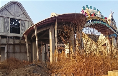 津南区小站镇津歧公路与昌盛路交口处的水果侠盗梦空间,号称十万平方米的主题乐园,如今围挡大面积倒塌,七八组卡通形态的大型游乐设施建筑都已破败不堪,建筑之间的空地上长满杂草,崎岖不平,有的井内的线缆已被拆空,只有原本大门上的“水果侠盗梦空间”还在提示着它曾经的设计用途。