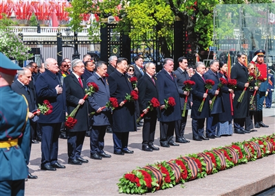 庆典结束后,习近平同其他国家领导人一起从红场来到亚历山大花园,向无名烈士墓献花,并肃立默哀。随后,各国领导人集体合影留念。