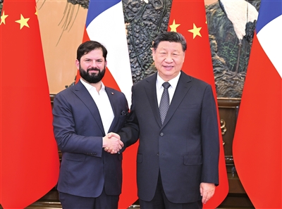 博里奇表示,智利高度重视对华关系。中国已成为智利最重要的贸易伙伴,双方合作造福了两国人民。智方将坚定奉行一个中国原则,期待与中方进一步拓展贸易、投资、人工智能等领域合作,高质量共建“一带一路”,密切人文交流,推动智中关系取得更多实实在在的成果。各国应坚持自由贸易和互利共赢,贸易不应只服务于一国私利,发动贸易战没有出路。智方愿同中方一道,坚定捍卫多边主义和联合国权威,坚持通过对话解决分歧,共同维护国际公平正义。