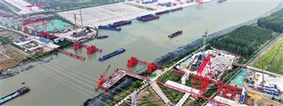 5月16日,新建潍坊至宿迁高速铁路跨京杭运河特大桥主桥首节钢桁梁成功吊装到预定位置,标志着大桥建设正式进入上部结构施工新阶段。