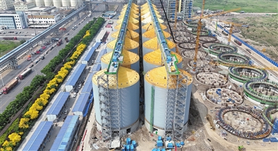 近日,中冶天工临港现代粮食物流产业园区粮食仓储物流集散中心项目主体结构通过验收。建成后将带动区域粮食产业链集聚发展,保障国家粮食安全。 记者 张磊 摄