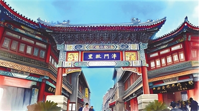 青灰琉璃瓦在水彩笔触中流淌成蜿蜒的银河,天津古文化街的飞檐翘角在蓝天白云下舒展着有层次感的褶皱。朱红梁柱间的苏式彩绘,以敦煌壁画的笔法晕染;以水墨重彩的笔法,描写勾勒中国建筑传统纹样,将六百多年的城市繁华凝固成流动的诗行。