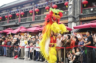 昨日,在天津古文化街宫前广场,传统花会表演精彩纷呈。