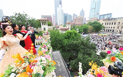 漫步在广场上,游人们一抬头,便能看到西北角楼阳台上精心梳妆的“茶花女”,随之《他也许是我渴望见到的人》《普罗旺斯的陆地和海洋》等经典咏叹调也在耳畔悠扬响起。当欢快热烈的《饮酒歌》旋律响起时,全场气氛瞬间被点燃,广场上的游人们也随着音乐欢呼互动起来,现场犹如歌剧中热闹非凡的盛大舞会。