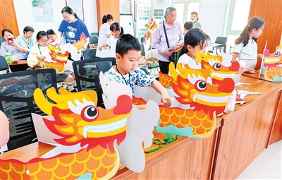 日前,河东区青少年事务社工在唐家口街道御景嘉园社区组织开展“端午竞渡变装秀,我的龙舟最拉风”活动。孩子们在社工的指导下,充分发挥想象力,用提前准备好的纸板、布料等材料拼接、制作可穿戴的“龙舟”道具。制作完成后,孩子们穿上自己制作的“龙舟”,模仿划龙舟的动作,轮流展示作品,现场笑声不断,将活动推向了高潮。