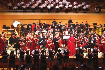 音乐会下半场,两支乐团率先演绎了改编版《变体新水令》,华贵典雅的旋律,吴侬软语般的丝竹风韵,让观众深深沉醉于国乐的旋律美与意境美之中。“逐梦”筝团首演的古筝重奏《闲居吟》,以清妙典雅的旋律将隐居生活的淡泊宁静刻画得淋漓尽致;男高音歌唱家肖玛演唱的赵元任创作的经典艺术歌曲《教我如何不想她》,经过重新编配民族管弦乐伴奏,焕发出新的艺术生命力;陈军创作并演奏的二胡与乐队作品《狂野飞骏图》,展现了二胡独特的艺术表现力;宋飞演绎的二胡与乐队作品《天籁华吟》,将二胡的歌唱性与技巧性完美呈现,与乐队形成精彩对话。最后,音乐会在天津音乐学院全体二胡师生齐奏的《光明行》中激昂落幕。在指挥家马丁的指挥下,演奏家们将这首创作于1931年的经典进行曲演绎得激越昂扬,展现出中国知识分子追求光明的坚定信念。