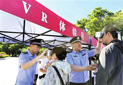 活动由天津市渔山强制隔离戒毒所联合蓟州区禁毒专项工作机制办公室等单位主办,现场设置了VR(虚拟现实)体验区、毒品展示区、政策讲解区、游戏互动区等,最吸引眼球的当数VR体验区。在这里,虚拟现实技术将毒品危害直观、生动地展现在群众眼前。在VR技术营造的虚拟场景中,参与体验的市民“亲眼”目睹了自己因沾染毒品,从健康变得面容憔悴、精神恍惚的痛苦过程,一旁的戒毒警察则“趁热打铁”,结合群众体验感受,详细讲解了毒品对个人、家庭和社会造成的严重危害,以及相关的禁毒戒毒法律法规。