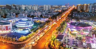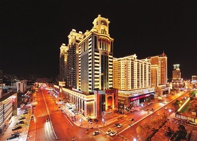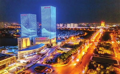 夜幕降临,我市友谊路沿线灯火璀璨,水晶宫饭店、津谊桥、莲花酒店等地标建筑披上绚丽的光影外衣。