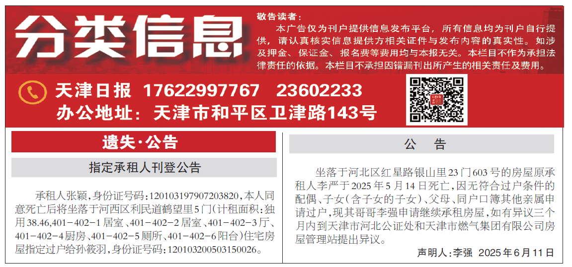 天津日报所有作品,版权均属于天津海河传媒中心,受《中华人民共和国著作权法》的保护。所有关于天津日报内容产品的数字化应用,包括但不限于稿件签约、网络发布、转稿等业务,均需与天津海河传媒中心商谈,与天津海河传媒中心有互换稿件协议的网站,在转载数字报纸稿件时注明“来源-天津海河传媒中心天津日报”和作者姓名,未与天津海河传媒中心有协议的网站,谢绝转稿,违者必究。