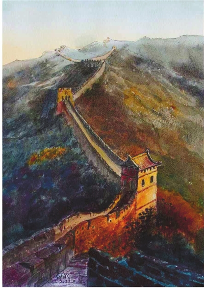 黄崖关长城始建于北齐天保七年(556年),位于蓟州区北部的崇山峻岭之巅。天津辖域内全长40余公里,因其水陆关隘、边城掩体、战台烟墩、古寨营盘一应俱全,被誉为“万里长城之缩影”。我创作的这幅水彩作品,技法上先以钢笔墨线塑形,再以水彩的金黄色暖调漫过,衬托出“黄崖夕照”的奇观色彩;同时,晕染关内关外的层峦叠翠,表达历史烟云的具象,彰显民族精神的璀璨光芒。