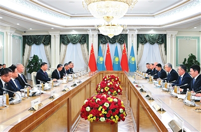 当地时间6月16日下午,哈萨克斯坦总统托卡耶夫同中国国家主席习近平在阿斯塔纳总统府举行会谈。