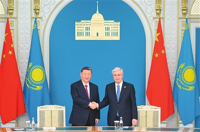 当地时间6月16日下午,哈萨克斯坦总统托卡耶夫同中国国家主席习近平在阿斯塔纳总统府举行会谈。会谈后,两国元首共同见证双方交换10余份双边合作文件。这是习近平同托卡耶夫握手。 新华社记者 李涛 摄