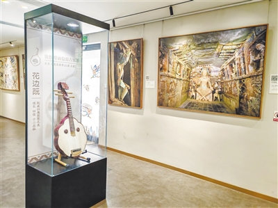 如,“反弹琵琶”一直以来都是人们心目中敦煌的“文化标签”。展览展出了莫高窟第112窟的南壁《观无量寿经变》中的一幅乐舞图,画面中,乐师们拿着横笛、箜篌等乐器在演奏,位于中间位置的正是“反弹琵琶”的舞者。这个经典意象凭借独特的艺术魅力,穿越时光长河,烙印在人们心中。动画片《九色鹿》曾是“80后”“90后”不可磨灭的童年回忆,它是根据莫高窟第257窟《鹿王本生图》改编而成的,本次展览截取了中间的一部分进行展出。动人的故事与敦煌壁画独特的艺术神韵、美学价值一起流传至今。