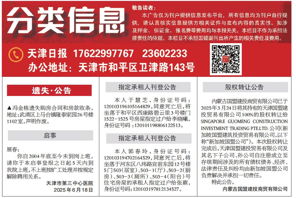 天津日报所有作品,版权均属于天津海河传媒中心,受《中华人民共和国著作权法》的保护。所有关于天津日报内容产品的数字化应用,包括但不限于稿件签约、网络发布、转稿等业务,均需与天津海河传媒中心商谈,与天津海河传媒中心有互换稿件协议的网站,在转载数字报纸稿件时注明“来源-天津海河传媒中心天津日报”和作者姓名,未与天津海河传媒中心有协议的网站,谢绝转稿,违者必究。