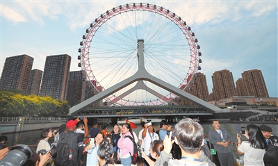 夕阳掩映,蜿蜒的海河宛若一幅流动的历史长卷;华灯初上,海河两岸迎来最美时刻。中外记者登上游船,感受城市旖旎风景。“这就是白天看到的古文化街,夜景也这么美!”俄罗斯斯维尔德洛夫斯克州《州报》记者马克西姆·纳契诺夫赶忙用镜头记录下难忘一刻,“一天的行程很快,很多景点让人依依不舍,我还记住了世纪钟、解放桥、‘天津之眼’。”