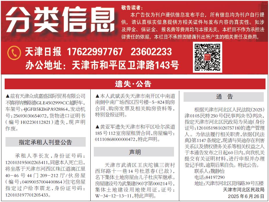 平媒总编室:022-23602716 中心办公室:022-23602888 海河传媒广告有限公司:022-23602233