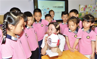 日前,河东区第五幼儿园邀请向阳楼街社区卫生服务中心医生走进校园,为孩子们普及健康用眼知识。