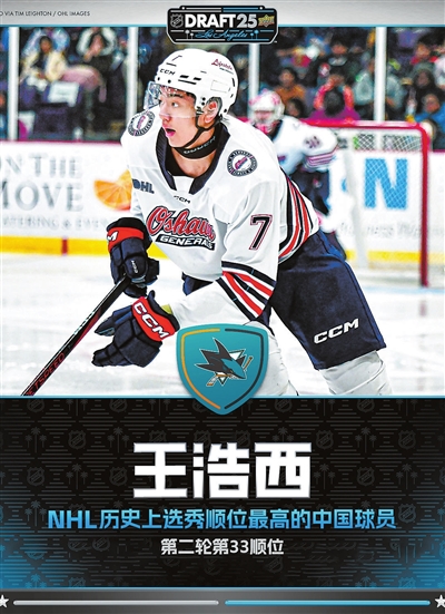 本报讯(记者 李蓓)北京时间昨天,2025年NHL(北美职业冰球联盟)新秀选拔大会在洛杉矶进行。来自中国的冰球小将王浩西在第二轮首位即总第33顺位被圣何塞鲨鱼队选中,刷新了中国籍球员的NHL选秀最高顺位,创造了中国冰球的历史。