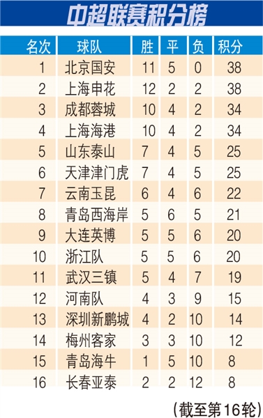 本报讯(记者 顾颖)中超联赛第16轮比赛昨天全部结束,联赛也因国足征战东亚杯进入短暂歇赛期。半程领跑积分榜的北京国安队,主场遭遇云南玉昆队强有力挑战,在先失一球的情况下,替补登场的张玉宁贡献一次助攻、制造一粒点球,帮助国安队2:1取胜锁定3分,继续领跑积分榜,积分与申花队并驾齐驱。