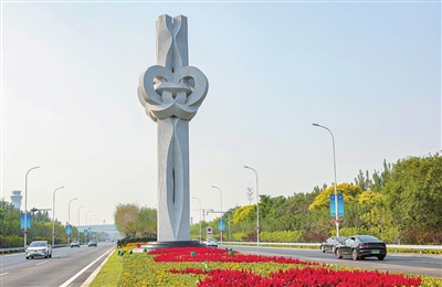 该项目绿化面积32公顷,新栽植乔灌木8000余株、绿篱5.3万平方米、铺设栽植草坪及地被草花20余万平方米,整体绿化布局错落有致,形成立体生态景观。市园林集团还同步完成对机场周边灯杆、箱体、标识牌等设施的清洗和油饰,并对相关地道立面实施真石漆喷涂。夜间,机场大道沿线的2000余套景观灯具流光溢彩,为城市增添浪漫氛围。此外,项目还建设了18米高的大型地标性当代公共艺术作品“四海同心”,凸显城市文化魅力。
