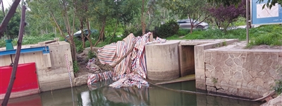 市民投诉的地点位于北辰区宜兴埠镇二街村村域内、宜兴埠驾校附近,外环河在这里由明河转为暗河。暗河前有一个水闸,闸口处有一道笼状网,网内的水面上堆积着厚厚的浮萍。水闸旁的绿地上,散落着不少已经死了的小鱼小虾和田螺,散发着恶臭,引得苍蝇乱飞。一块偌大的苫布堆在河坡,一部分已经浸入水中,脏兮兮的。