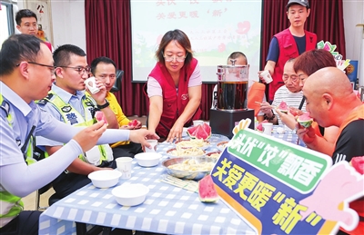 室内,社区阿姨们巧手翻飞,白胖的饺子整齐列队;切开的西瓜、煮好的绿豆汤散发着清香。这些特意准备的美食,是送给环卫工人、外卖骑手、快递员等户外工作者的慰问品。