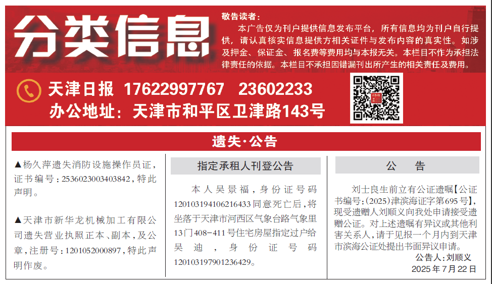 平媒总编室:022-23602716 中心办公室:022-23602888 海河传媒广告有限公司:022-23602233