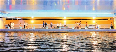 夏日夜晩,海河畔灯光璀璨,市民散步、闲坐、观景,享受都市的惬意与活力。
