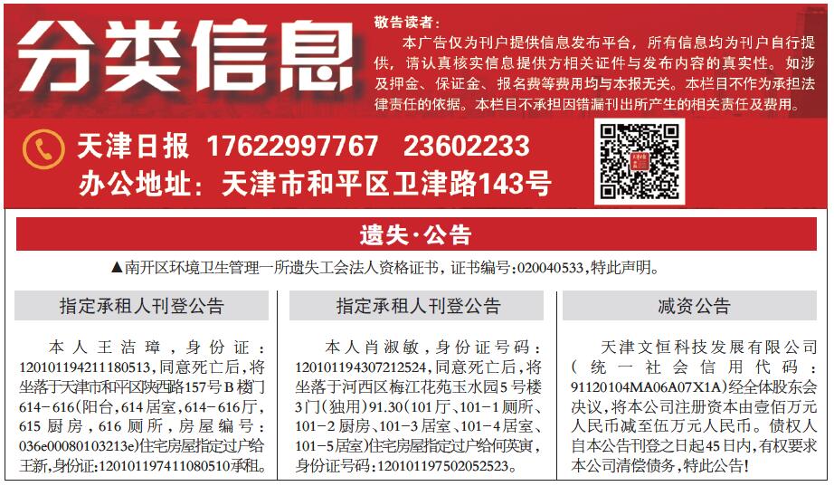 天津日报所有作品,版权均属于天津海河传媒中心,受《中华人民共和国著作权法》的保护。所有关于天津日报内容产品的数字化应用,包括但不限于稿件签约、网络发布、转稿等业务,均需与天津海河传媒中心商谈,与天津海河传媒中心有互换稿件协议的网站,在转载数字报纸稿件时注明“来源-天津海河传媒中心天津日报”和作者姓名,未与天津海河传媒中心有协议的网站,谢绝转稿,违者必究。