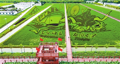 在津南区小站镇会馆村,以“上合回家·相约天津”为主题、占地53亩的巨型稻田画亮相。记者 潘立峰 摄