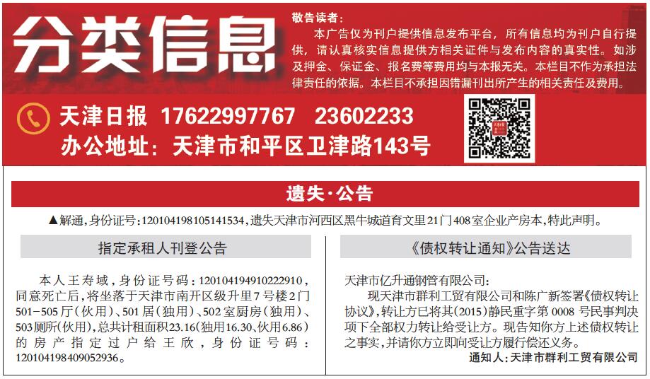 天津日报所有作品,版权均属于天津海河传媒中心,受《中华人民共和国著作权法》的保护。所有关于天津日报内容产品的数字化应用,包括但不限于稿件签约、网络发布、转稿等业务,均需与天津海河传媒中心商谈,与天津海河传媒中心有互换稿件协议的网站,在转载数字报纸稿件时注明“来源-天津海河传媒中心天津日报”和作者姓名,未与天津海河传媒中心有协议的网站,谢绝转稿,违者必究。