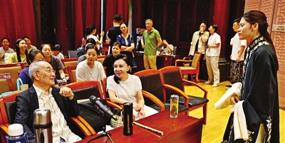 排练现场,每位老师充分利用一切时间给学员说戏。学员表演、演奏时,老师在旁边全神贯注地看着他们的表现,待学员一下场,马上趁着热乎劲儿给予点拨,总是希望给年轻人“再多说点儿”。学员们则是聚精会神地聆听指导,努力吸收艺术养分,扎扎实实地提高水平。这样的情景也让叶少兰深感欣慰,他说:“天津市青年京剧团有很好的传统,在艺术继承发展、守正创新方面取得了很好的成绩。这次培训班就把这些经验发挥出来了。现在的青年演员很有希望,所以要加强舞台的实践和深刻的学习,把这出戏学会了、学对了。我看了他们这几天的排练,感觉年轻人都很努力,而且每天都在进步,培训班的效果很好。”