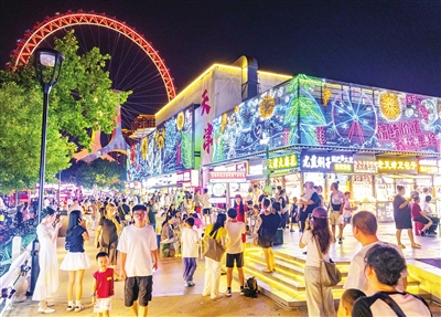 夜色中海河沿线景点、特色街区游人如织,人们或欣赏美丽夜景,或品尝特色美食。