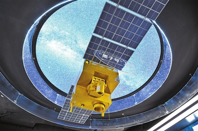 在位于合肥的中电信量子信息科技集团有限公司科技体验馆内拍摄的“墨子号”量子卫星模型。