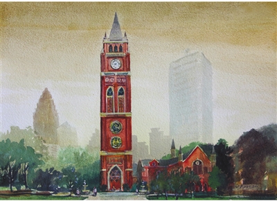五大道公园是天津市和平区五大道文化旅游区新的地标建筑。建筑细节融入了五大道经典建筑符号。钟楼借鉴西方古典主义“五段式”结构,高宽比6∶1,兼具稳重感与挺拔感。我的这幅画,构图主体上以公园入口的英伦风格钟楼为视觉中心,突出其巍峨轮廓,强化地标属性,以现代高楼为背景,形成“历史建筑/都市发展”的时空对话,隐喻城市文脉的延续;色调运用上,借天空的暖黄色与树木的暖绿色,以水彩的透明质感渲染柔和光影,弱化建筑线条的硬朗感,烘托“岁月静好”的意境,既展现五大道的历史厚重感,又赋予画面温馨、平和的现代生活气息。